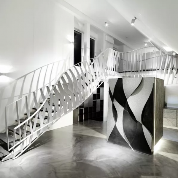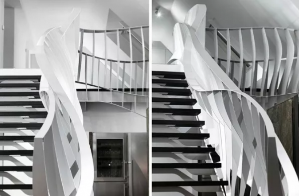 設(shè)計(jì)師的巧妙設(shè)計(jì),原本生硬的鋼材,經(jīng)過激光切割機(jī)加工,再進(jìn)行現(xiàn)場定位焊接之后,呈現(xiàn)出流線形狀,成為與生活中常見的樓梯截然不同的藝術(shù)品。