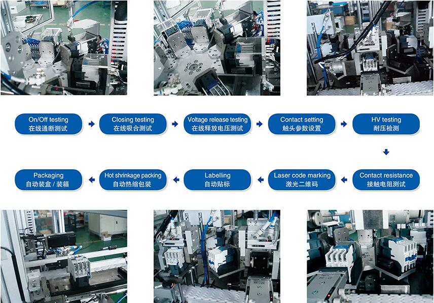 楚天光電激光完成交 / 直流接觸器的產品半自動裝配,采用人工、部件裝配半自動工裝、全自動螺絲裝配機相結合的模式。自動性能指標測試,包含通斷,吸合、釋放電壓、保持功耗、觸 頭參數、耐壓、主觸頭接觸電阻等。產品包裝:主要包含激光二維碼、產品貼標,裝盒、熱縮包裝等工序。其中激光二維碼關聯到單件產品的所有測試參數。實現物流傳輸自動化。
